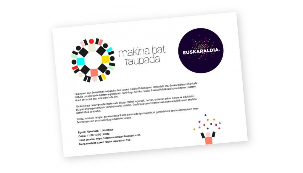 Larunbat honetan, abenduak 1, Euskal Eskola Publikoko kide izan diren edo diren lagunen tertulia ospatuko da Merkatuzarren. Euskaraldiaren baitan kokatzen da jarduera hau eta bere helburua da guztion artean Errenteriako eskola publikoaren errelato partekatua osatzea. Jarduera goizeko 11etatik ordubatera egingo da. Informazio gehiago: https://eepkomunitatea.blogspot.com/